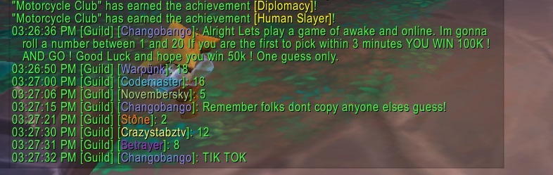 Now when I run a game in guild chat like the above guild posting It looks like the screen shot below. Lots of guildies rush to enter a number between 1 and 20. 3 minute Time limit.